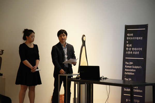 9月24日下午6时,第五届韩•中现代雕塑交流展在韩国首尔韩国美术馆开幕。参加本次展览的有103位韩国雕塑家及14位中国雕塑家。代表中国参展的是霍波洋、张克端、陈克、马强、魏二强、蒋铁俪、王志刚、徐悦翔、王立伟、朱勇、张若愚、罗幻、张勇、郭航等。展览开幕前,韩国雕刻家协会安排了一个小型的讲座,中韩各两位艺术家就“雕刻:与关系面对面”的主题作了简短的发言。韩国檀国大学教授金赫洙介绍了世界各国的大型陶瓷雕塑;弘益大学教授金范洙以自己的创作实践讲述了数码视觉对表现悲剧性场面的力量和处理方式。霍波洋总结了中国的美院从2008至2013年雕塑专业本科毕业创作的特点,从单一的写实具象慢慢走向更为开放的方向;张克端则以自己从80年代以来的雕塑作品向我们呈现出中国自改革开放以来雕塑创作实践发生的转变。